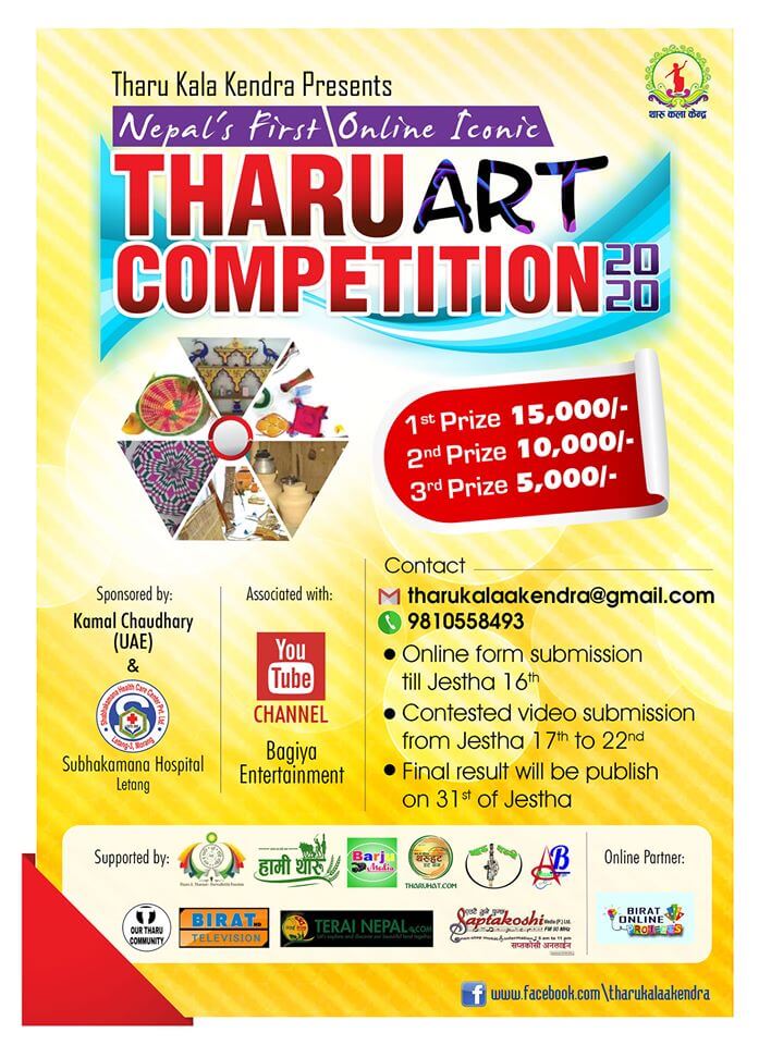 थारु कला केन्द्रले आयोजना गरेको अनलाइन थारु आर्ट प्रतियोगिताको भिडियो जेष्ठ ३२ गते सार्वजनिक हुने भएको छ। अनलाइन थारु आर्ट प्रतियोगितामा ४३ जनाले सहभागिता जनाएको छ भने अन्तिम निर्णय २०७७ असार ०९ गते गरिने......