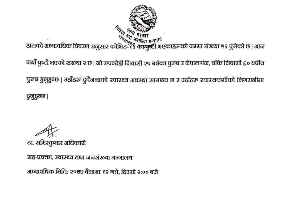 थप दुई जनामा आज कोरोनाको संक्रमण देखिएको छ । स्वास्थ्य तथा जनसंख्या मन्त्रालयले केहीबेर अघि सार्वजनिक गरेको सूचनाअनुसार आज दुई जनामा कोभिड २९ को संक्रमण देखिएको छ । यो सँगै नेपालमा संक्रमितको संख्या ५९ पुगेको पनि मन्त्रालयले जनाएको छ । नयाँ दुई जना संक्रमित रुपन्देही निवासी २५ वर्षीया पुरुष र बाँके निवासी ६० वर्षीया पुरुष छन् ।