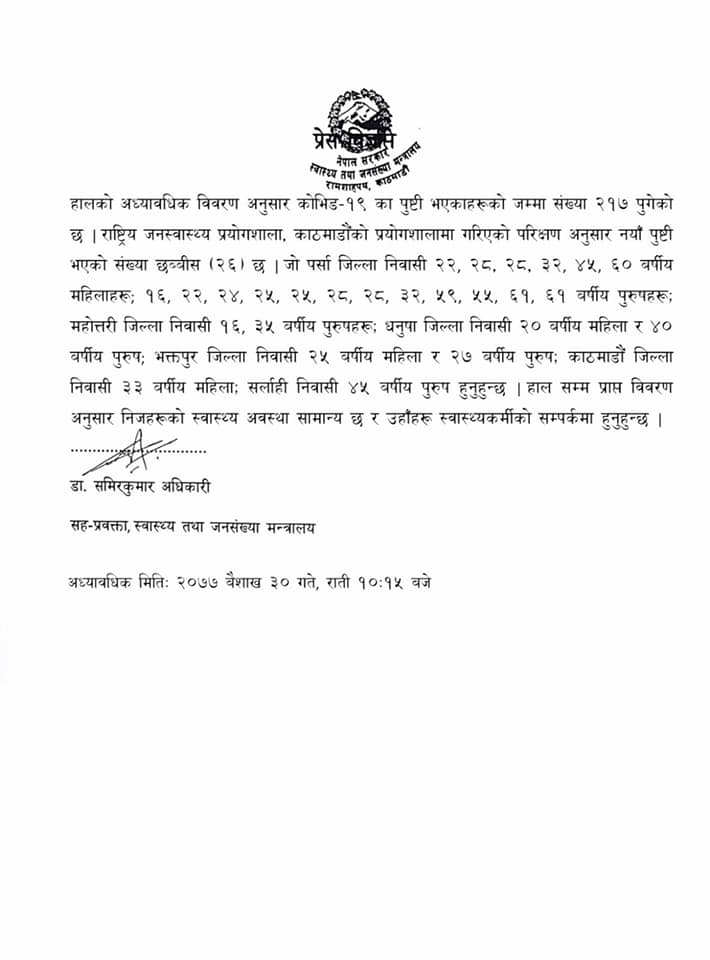 नेपालमा कोरोना संक्रमितको संख्या २ सय १७ पुगेको स्वास्थ्य मन्त्रालयले जनाएको छ। मंगलबार मात्रै ८३ संक्रमण पुष्टि भएको छ ।