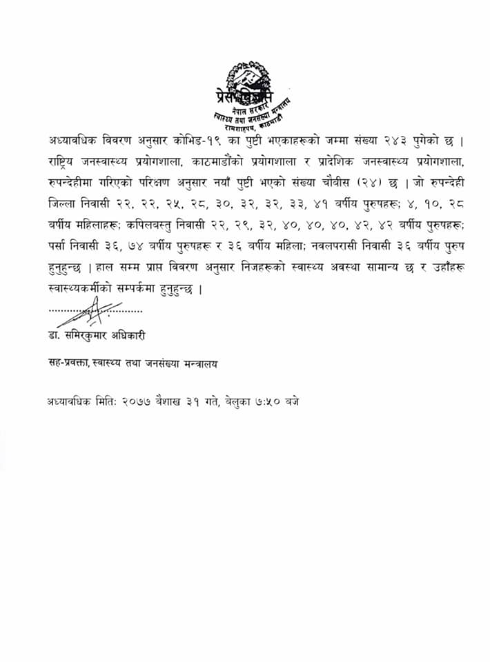 आज (बुधबार) थप २४ जना संक्रमण संक्रमितको संख्या २ सय ४३