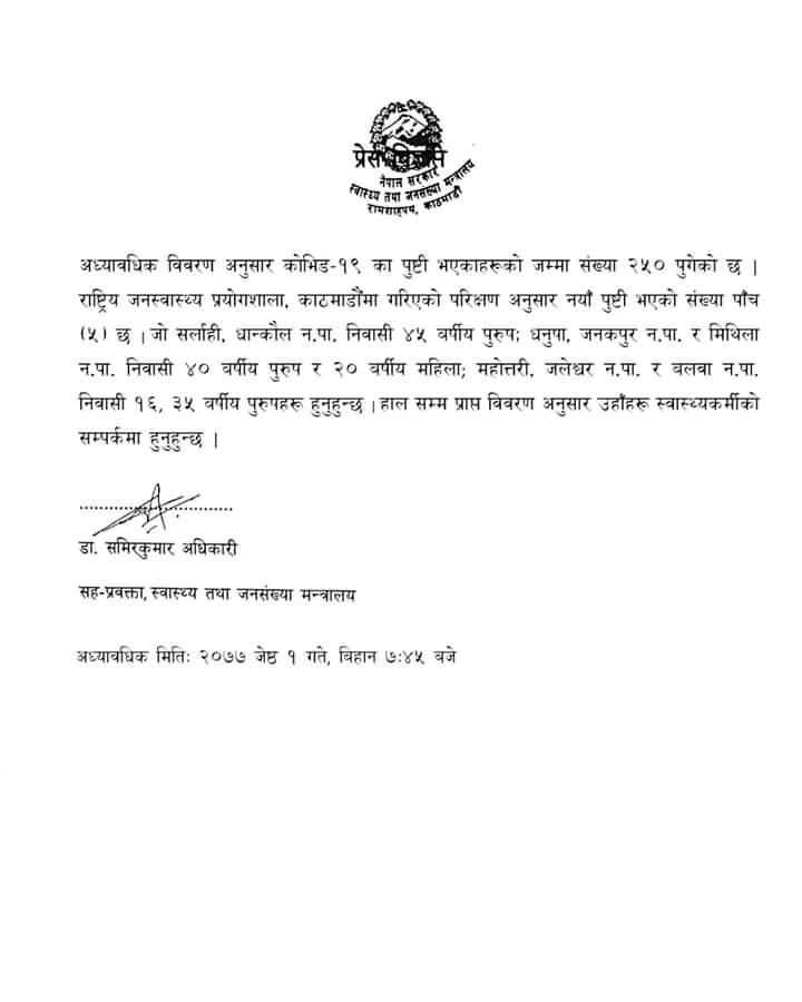 कोरोना संक्रमितको संख्या २ सय ५० पुगेको पुष्टि