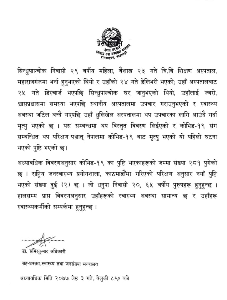 सुत्केरी महिलाको मृत्यु कोरोनाबाट भएको स्वास्थ्य मन्त्रालयद्वारा पुष्टि! थप २ जनामा कोरोना संक्रमण,