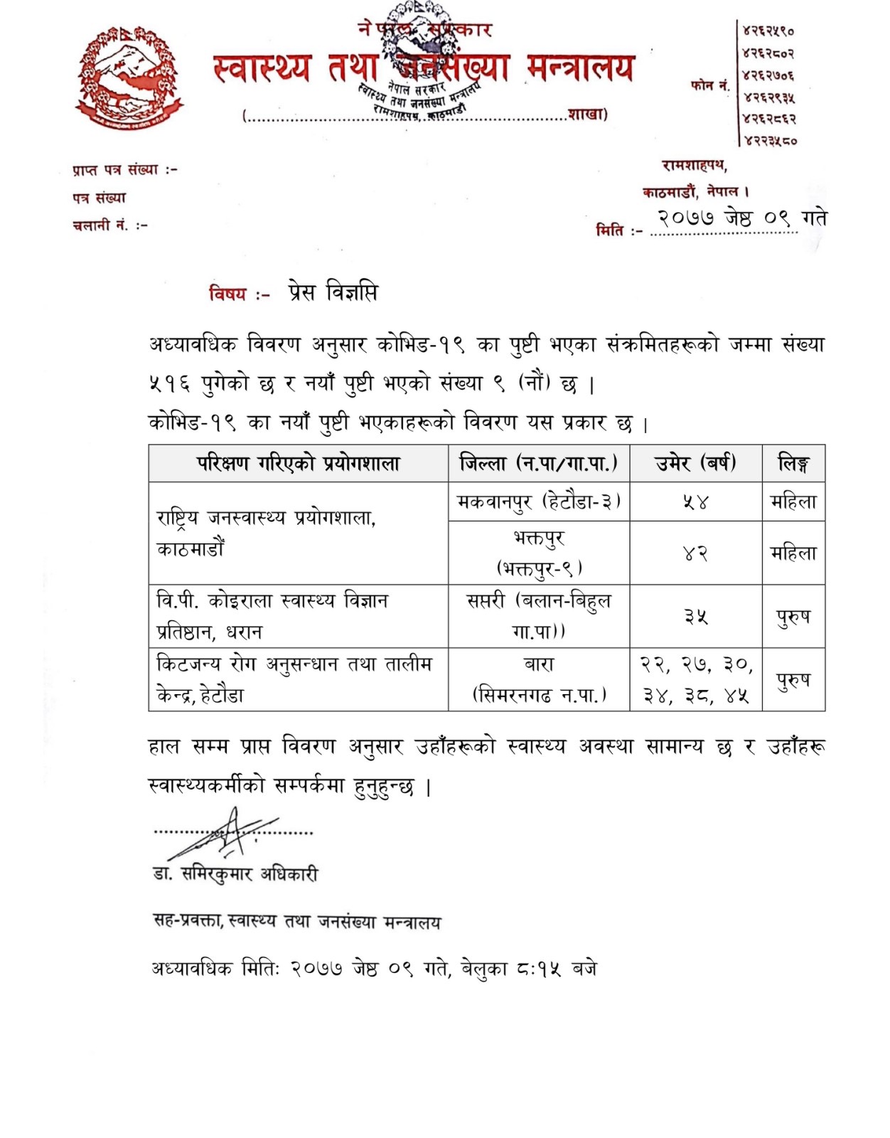 थप ९ जनामा कोरोना पुष्टि, संक्रमितको संख्या ५१६ पुग्यो