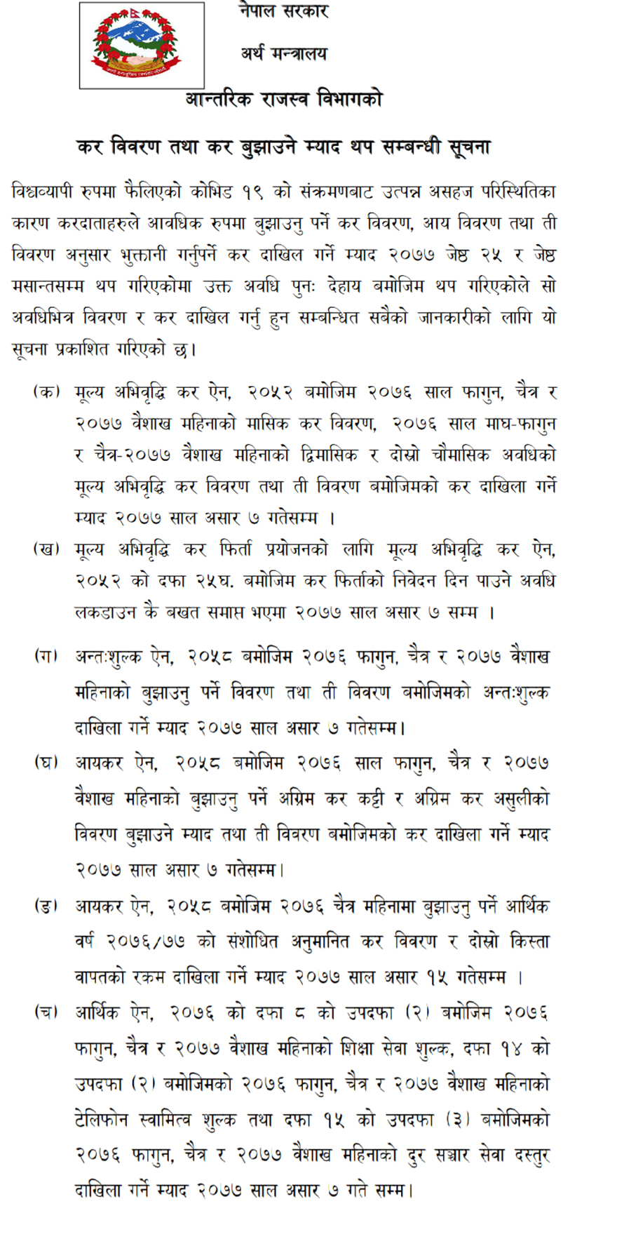 आन्तरिक राजश्व विभागले कर बुझाउने म्याद असार ७ गतेसम्म थप गरेको छ ।