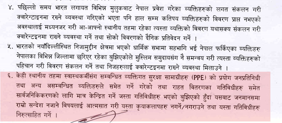सर्कुलरमा लेखिएको छ, ‘केही स्थानीय तहमा स्वास्थ्यकर्मीसँग सम्बन्धित व्यक्तिगत सुरक्षा सामग्रीहरु (पीपीई)को प्रयोग जनप्रतिनिधि तथा अन्य असम्बन्धित व्यक्तिहरुले समेत गर्ने गरेको तथा राहत वितरणका गतिविधिहरु समेत सार्वजनिकीकरणको लागि मात्र केन्द्रित गर्ने जस्ता गतिविधिहरु भएको बुझिएको हुँदा यसबाट जनमानसमा राम्रो सन्देश नजाने विषयलाई आत्मसात गरी यस्ता कृयाकलापहरु नगर्ने/नगराउने तथा यस्ता गतिविधिहरु निरुत्साहित गर्ने ।’