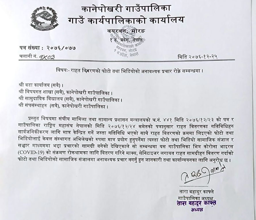 कानेपोखरी गाउँपालिकाले राहत वितरणका फोटो वा भिडियो सामाजिक सन्जलामा नराखी संस्थागत अभिलेखका रुपमा मात्र प्रयोग गर्न आग्रह गरेको छ ।