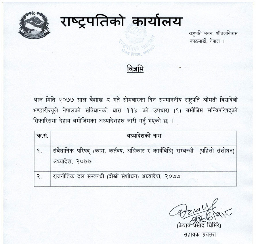 राष्ट्रपति कार्यालयका सहायक प्रवक्ता केशवप्रसाद घिमिरेले आज जारी गर्नुभएको प्रेस विज्ञप्तिमा राष्ट्रपति भण्डारीले नेपालको संविधानको धारा ११४ को उपधारा ९१० बमोजिम मन्त्रिपरिषद्को सिफारिसमा उक्त दुई अध्यादेश जारी गर्नुभएको उल्लेख छ ।